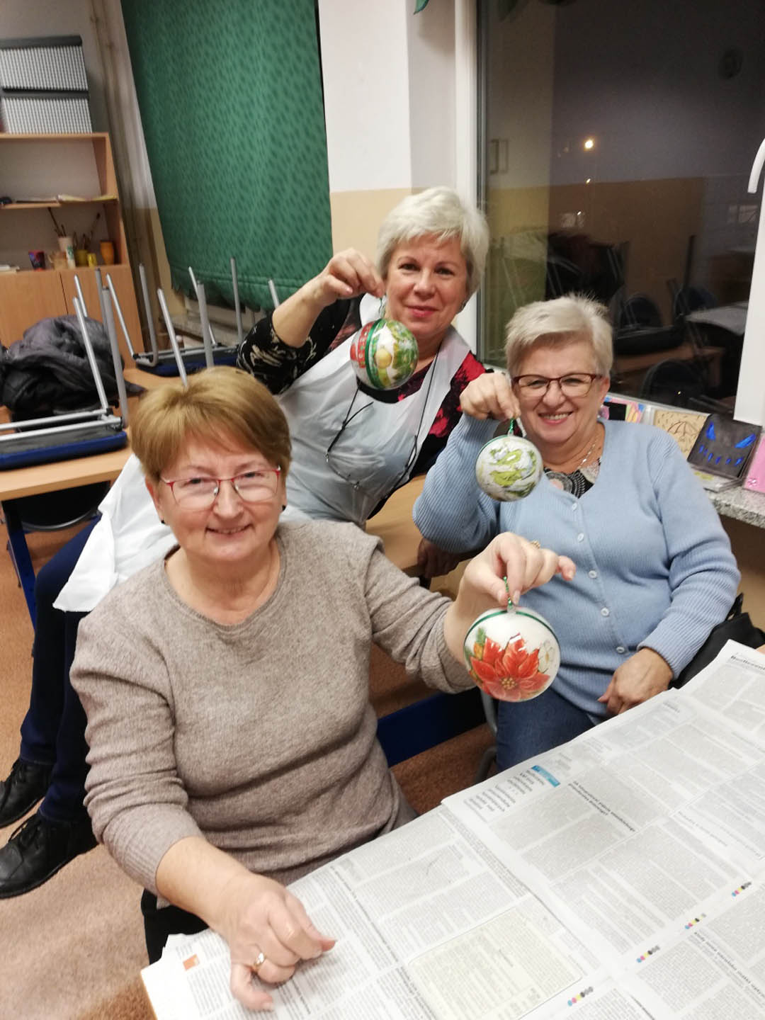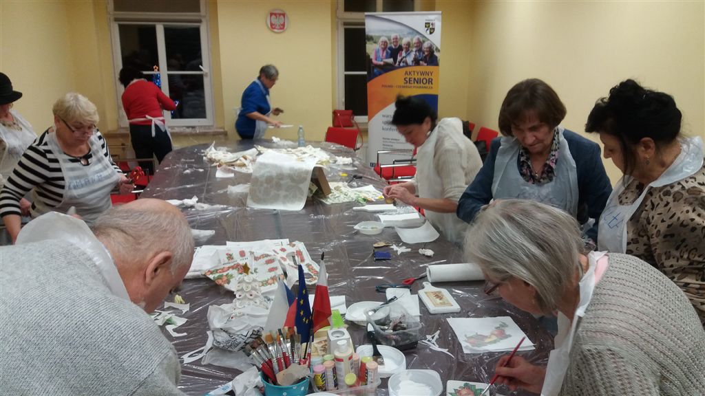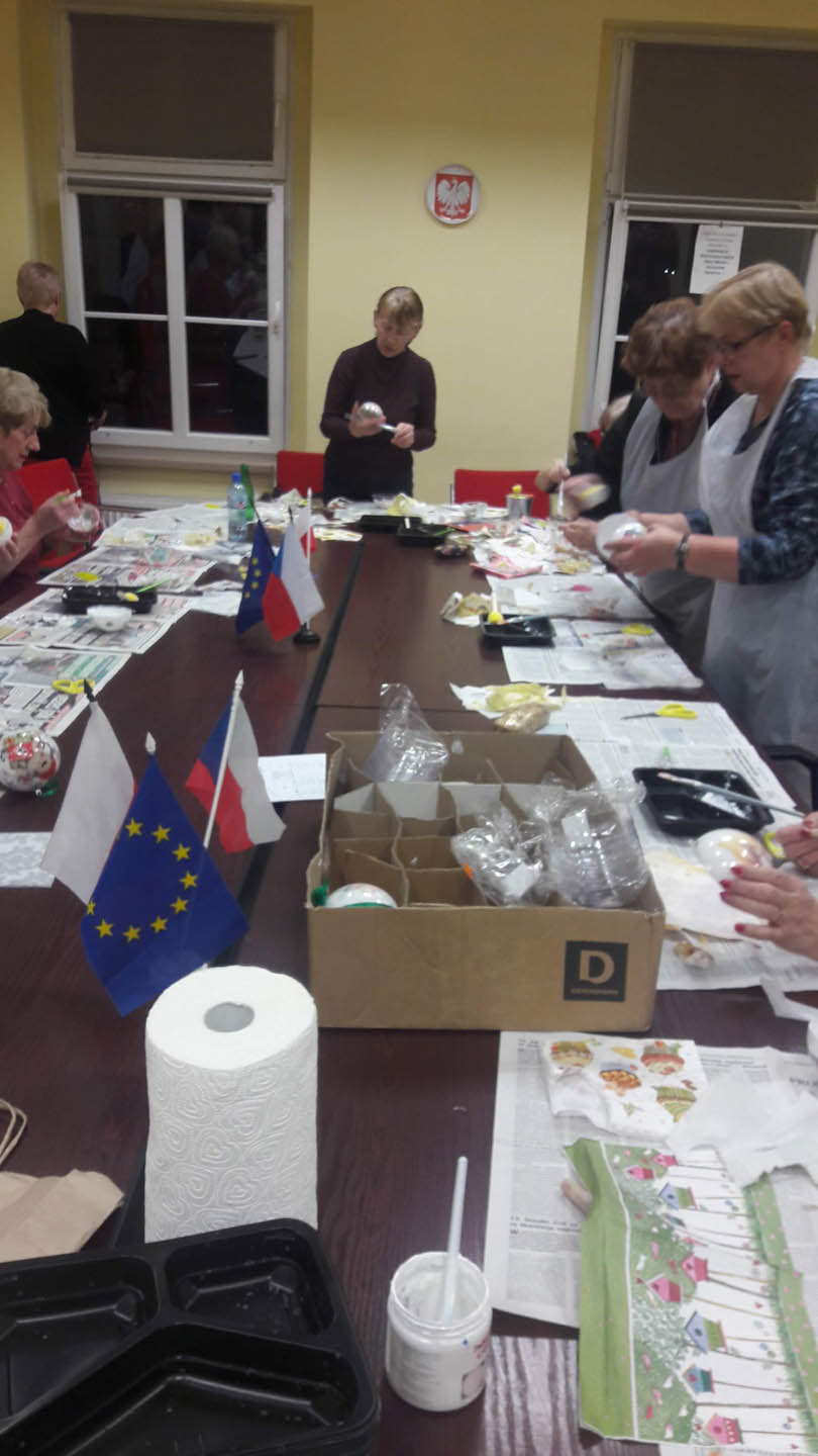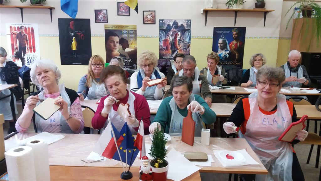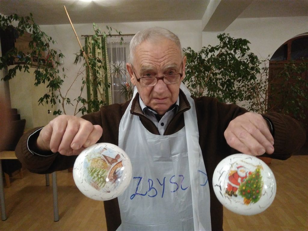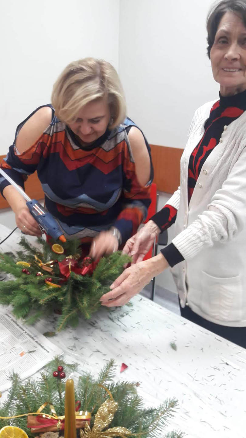 Podczas warsztatów w listopadzie, które przeprowadzone były dla każdej z grup, uczestnicy ozdobili wg własnych pomysłów stosując technikę decoupage: metalową doniczkę, anioła wykonanego ze sklejki, bombkę z pleksi, oraz wykonali stroik świąteczny.