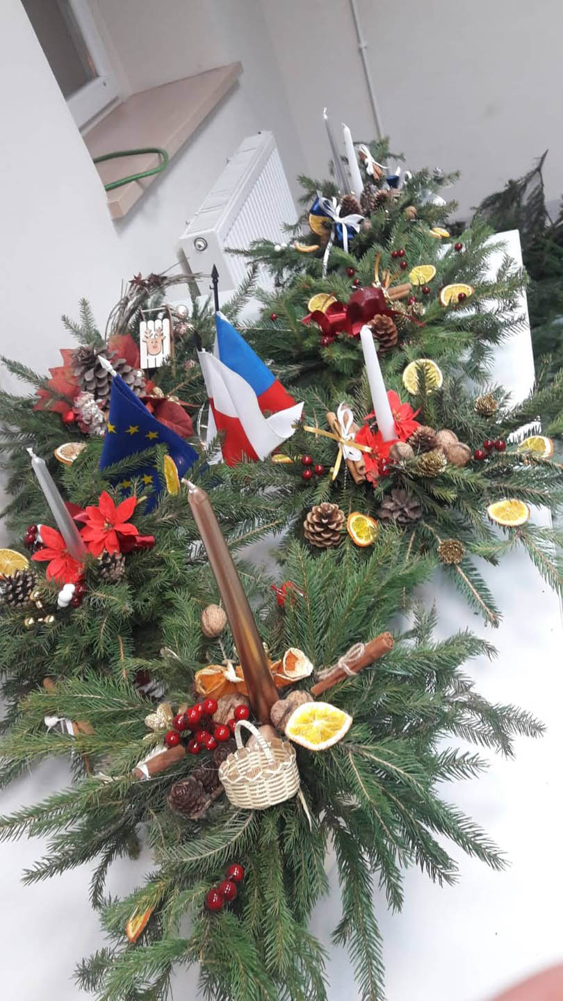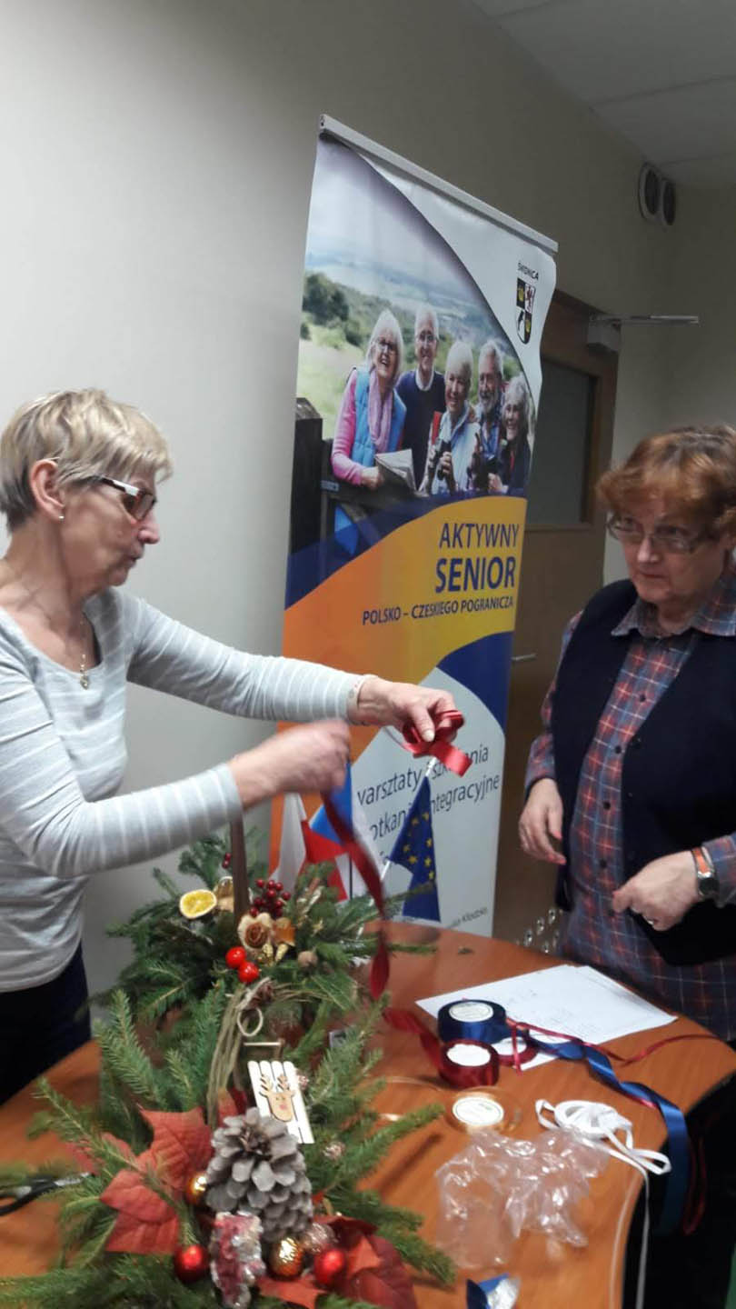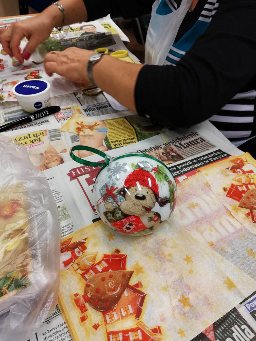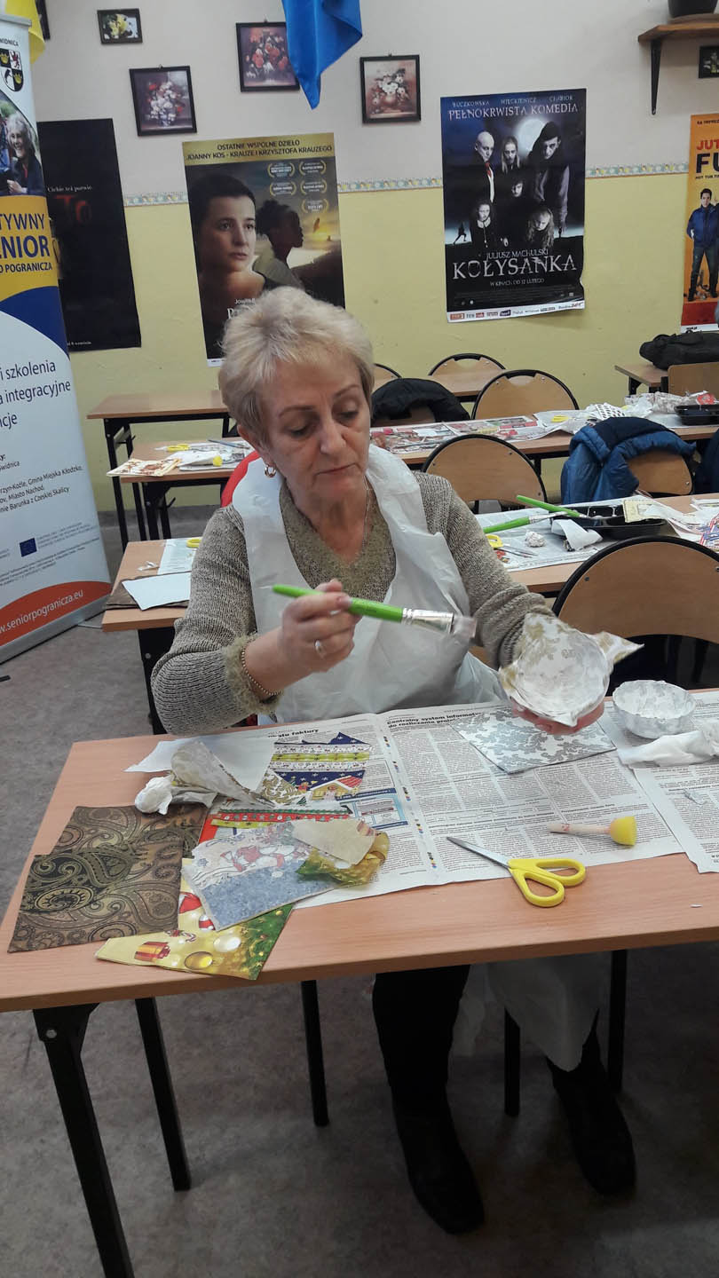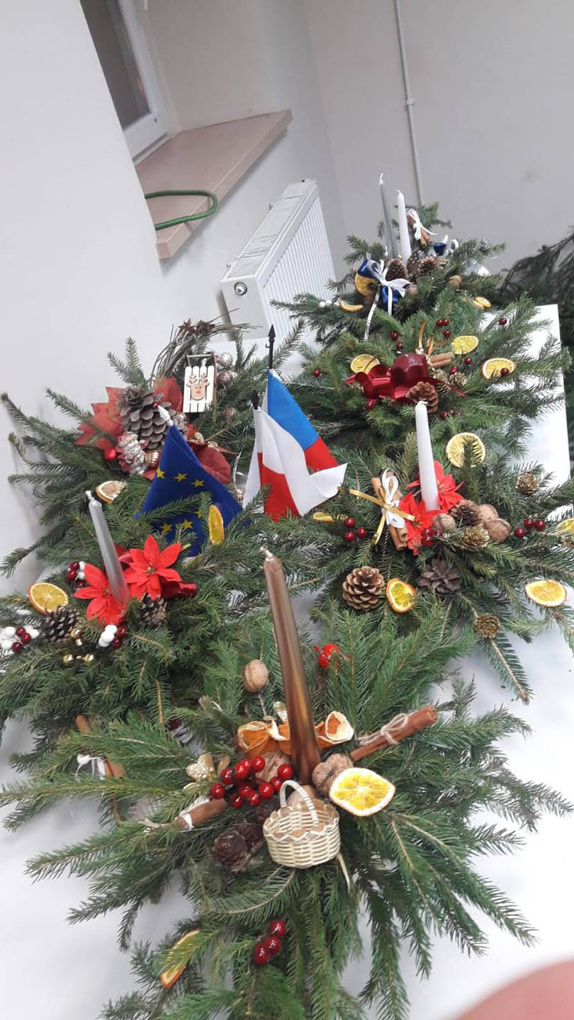 Podczas warsztatów w listopadzie, które przeprowadzone były dla każdej z grup, uczestnicy ozdobili wg własnych pomysłów stosując technikę decoupage: metalową doniczkę, anioła wykonanego ze sklejki, bombkę z pleksi, oraz wykonali stroik świąteczny.