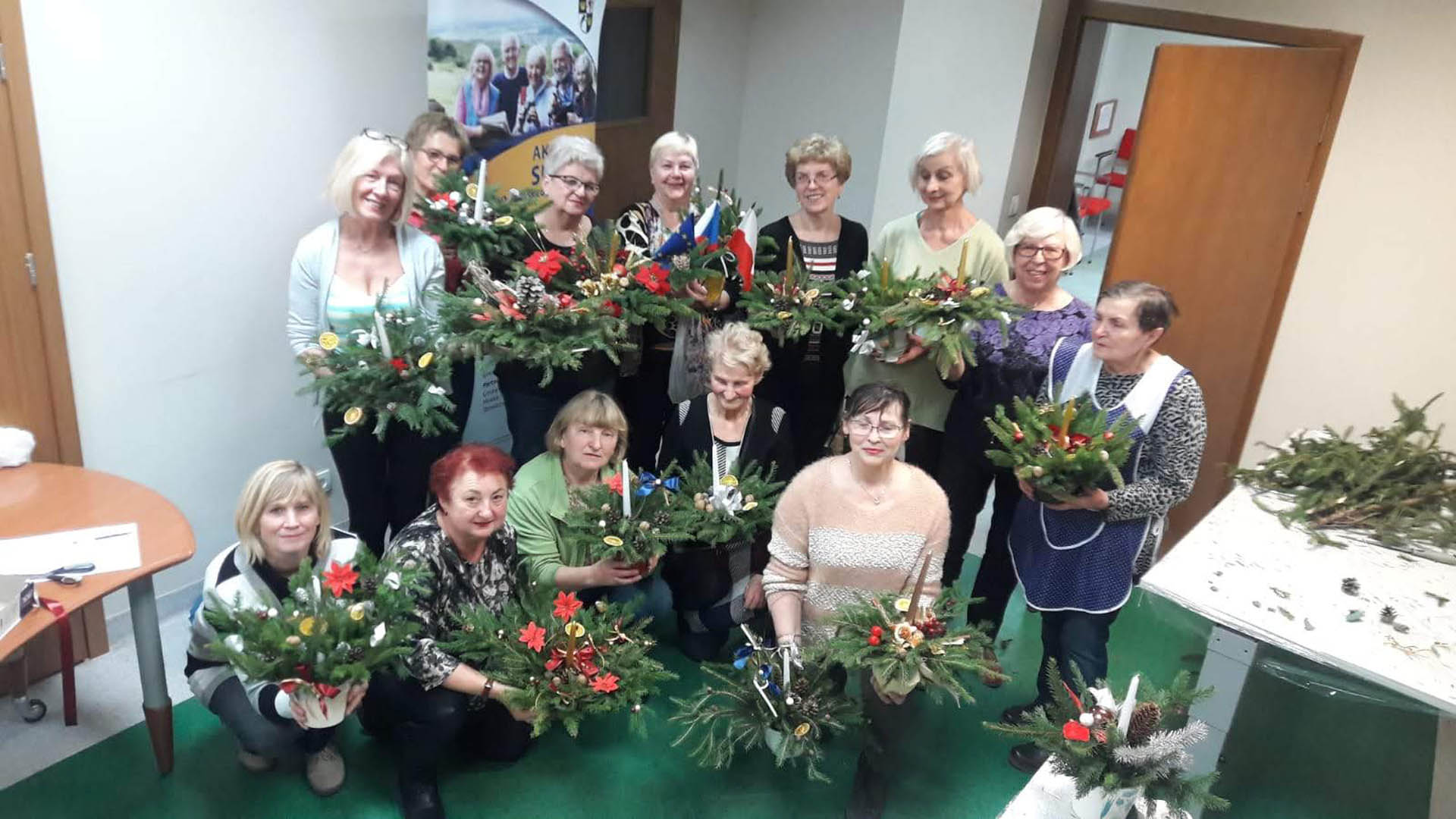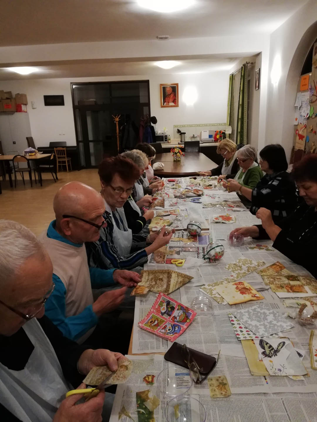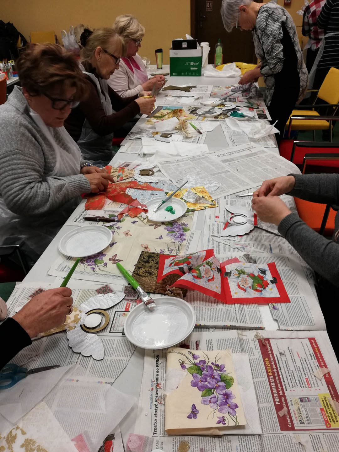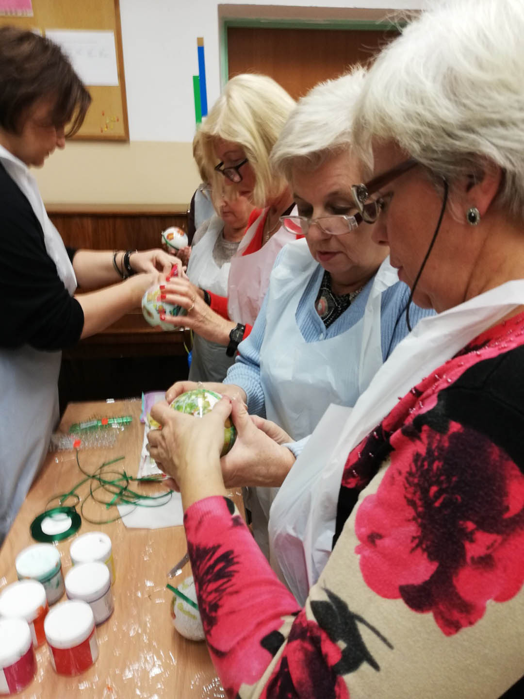 Podczas warsztatów w listopadzie, które przeprowadzone były dla każdej z grup, uczestnicy ozdobili wg własnych pomysłów stosując technikę decoupage: metalową doniczkę, anioła wykonanego ze sklejki, bombkę z pleksi, oraz wykonali stroik świąteczny.