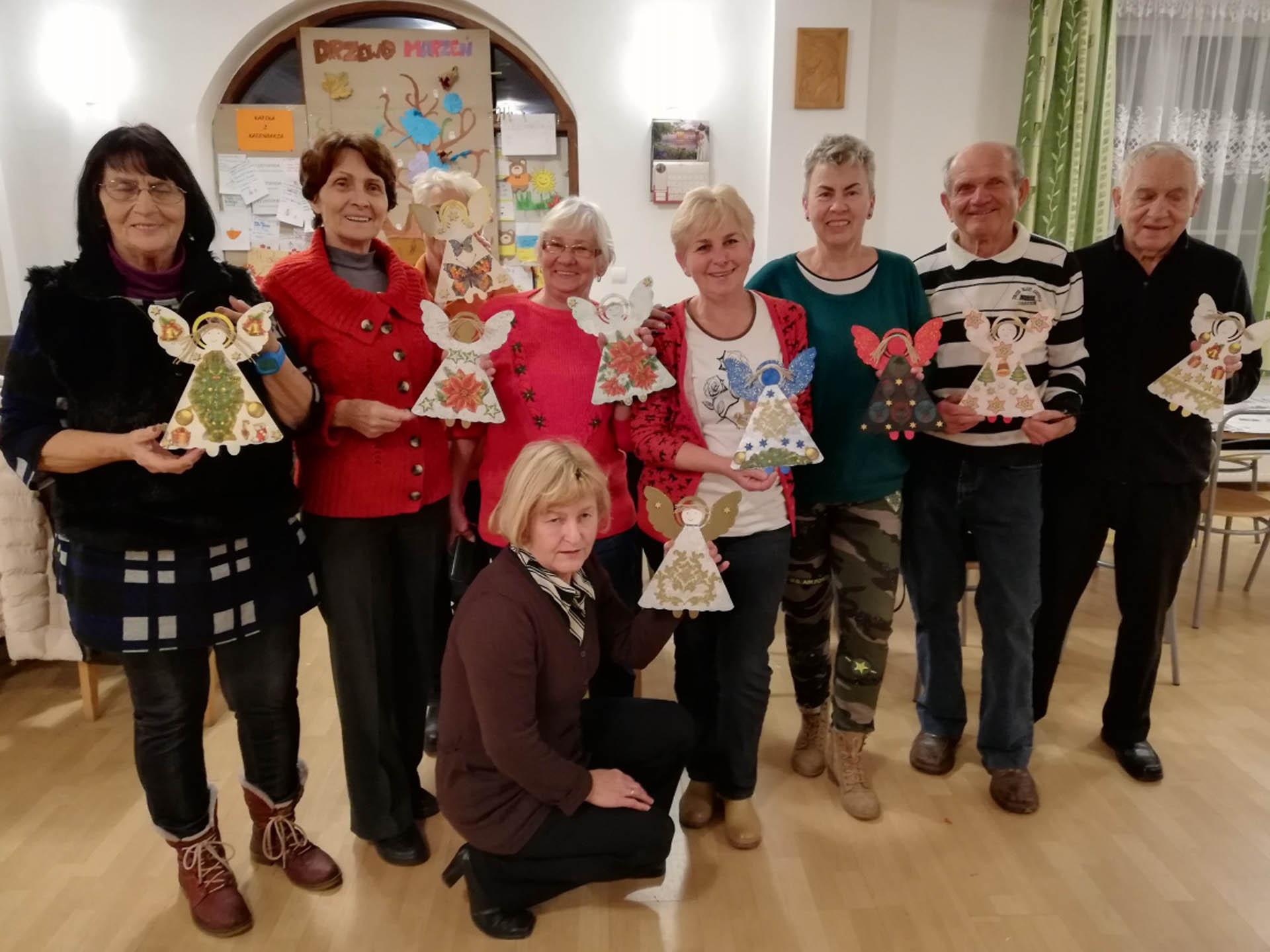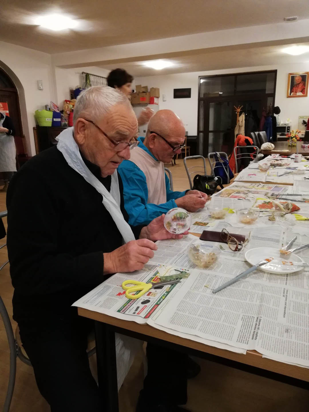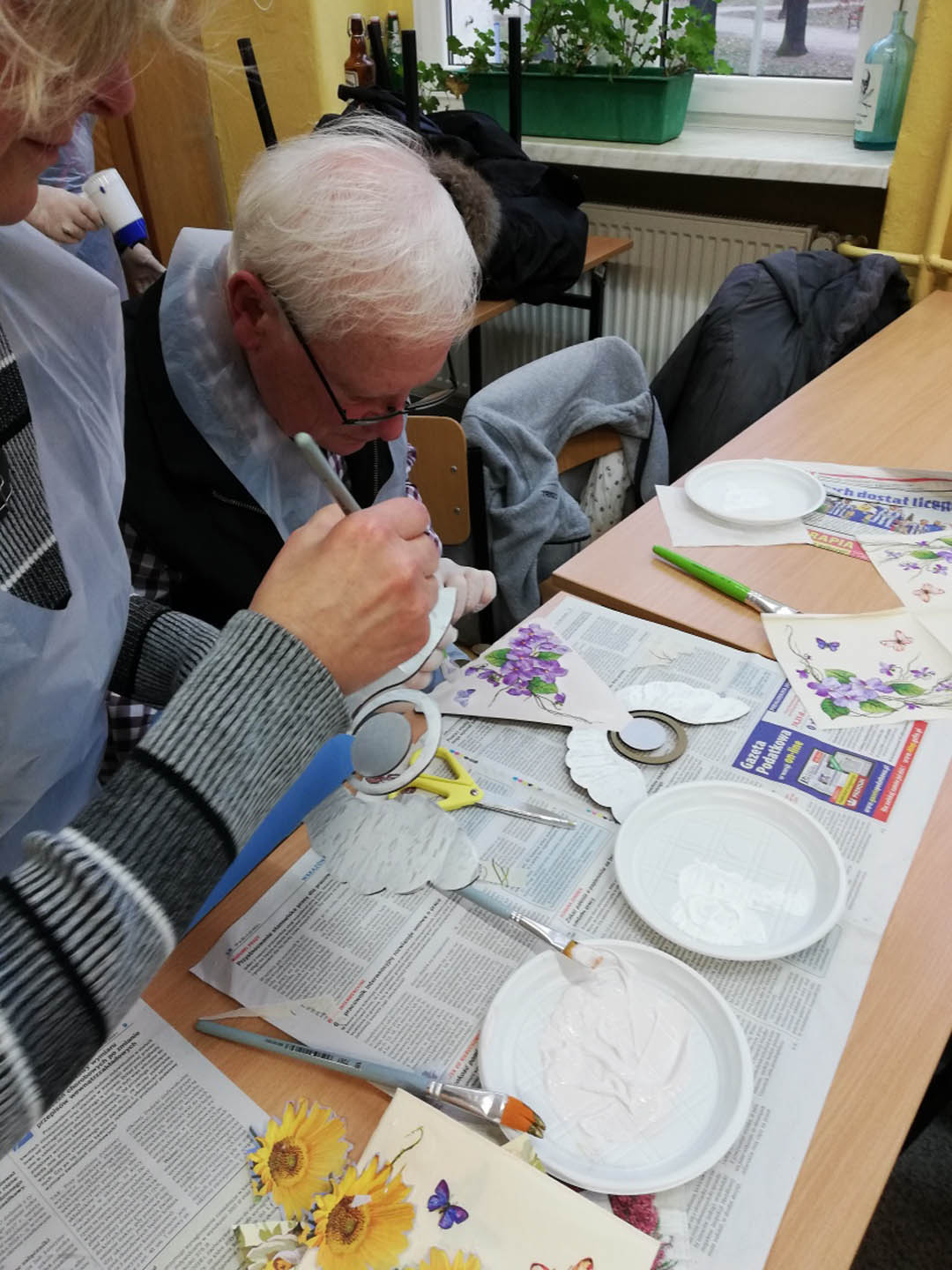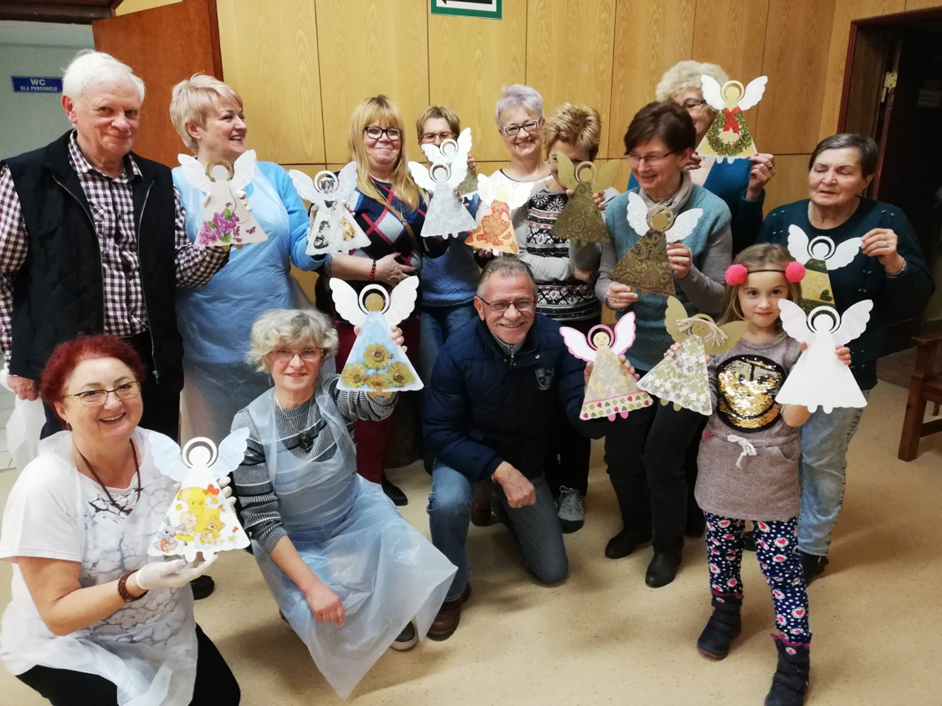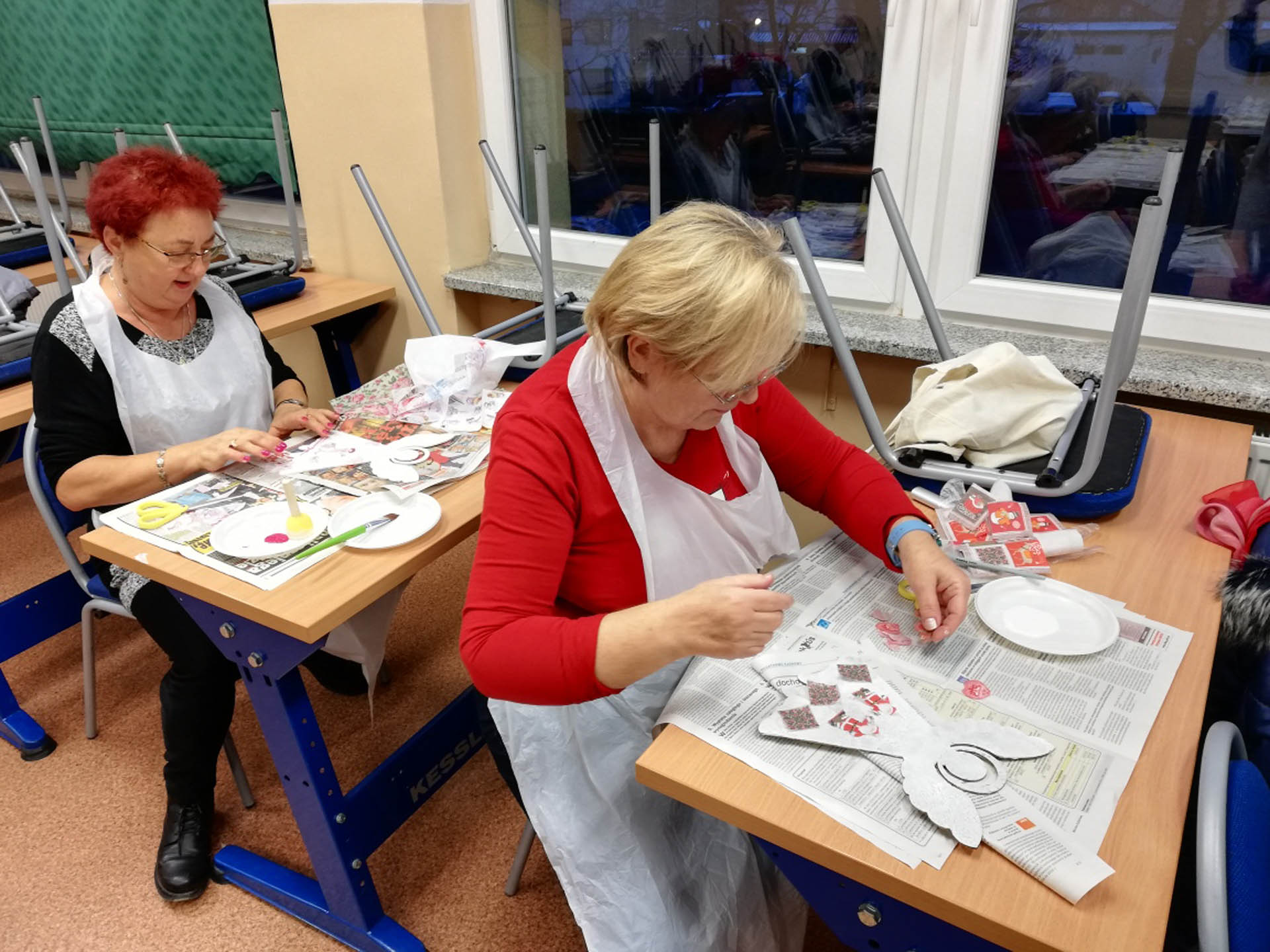 Podczas warsztatów w listopadzie, które przeprowadzone były dla każdej z grup, uczestnicy ozdobili wg własnych pomysłów stosując technikę decoupage: metalową doniczkę, anioła wykonanego ze sklejki, bombkę z pleksi, oraz wykonali stroik świąteczny.