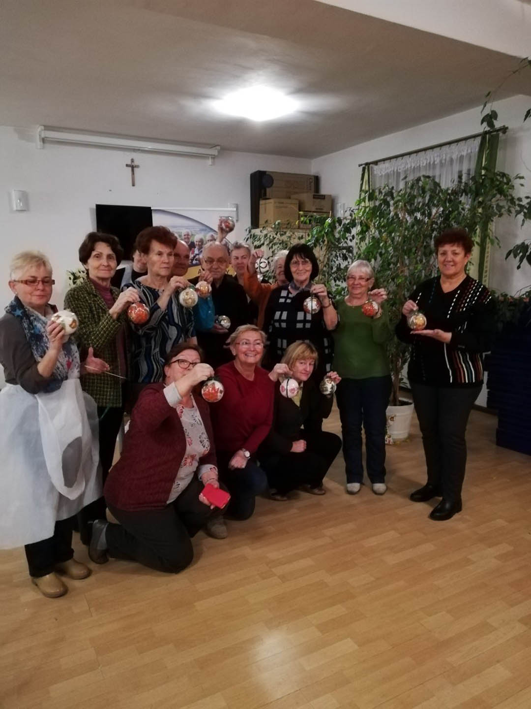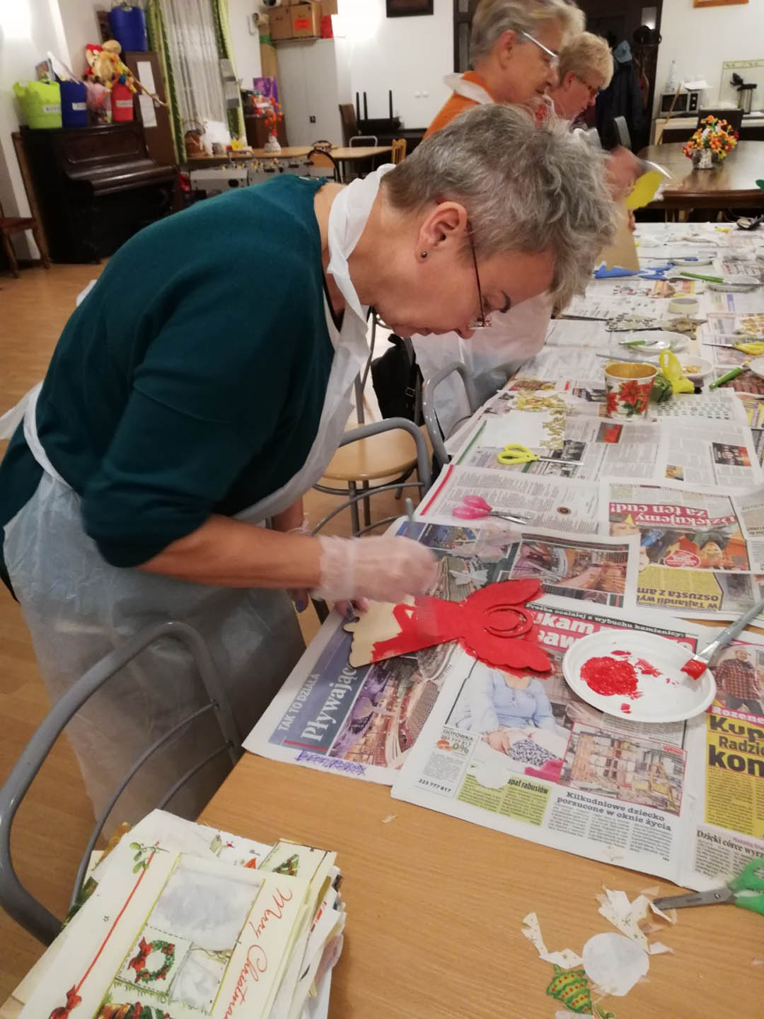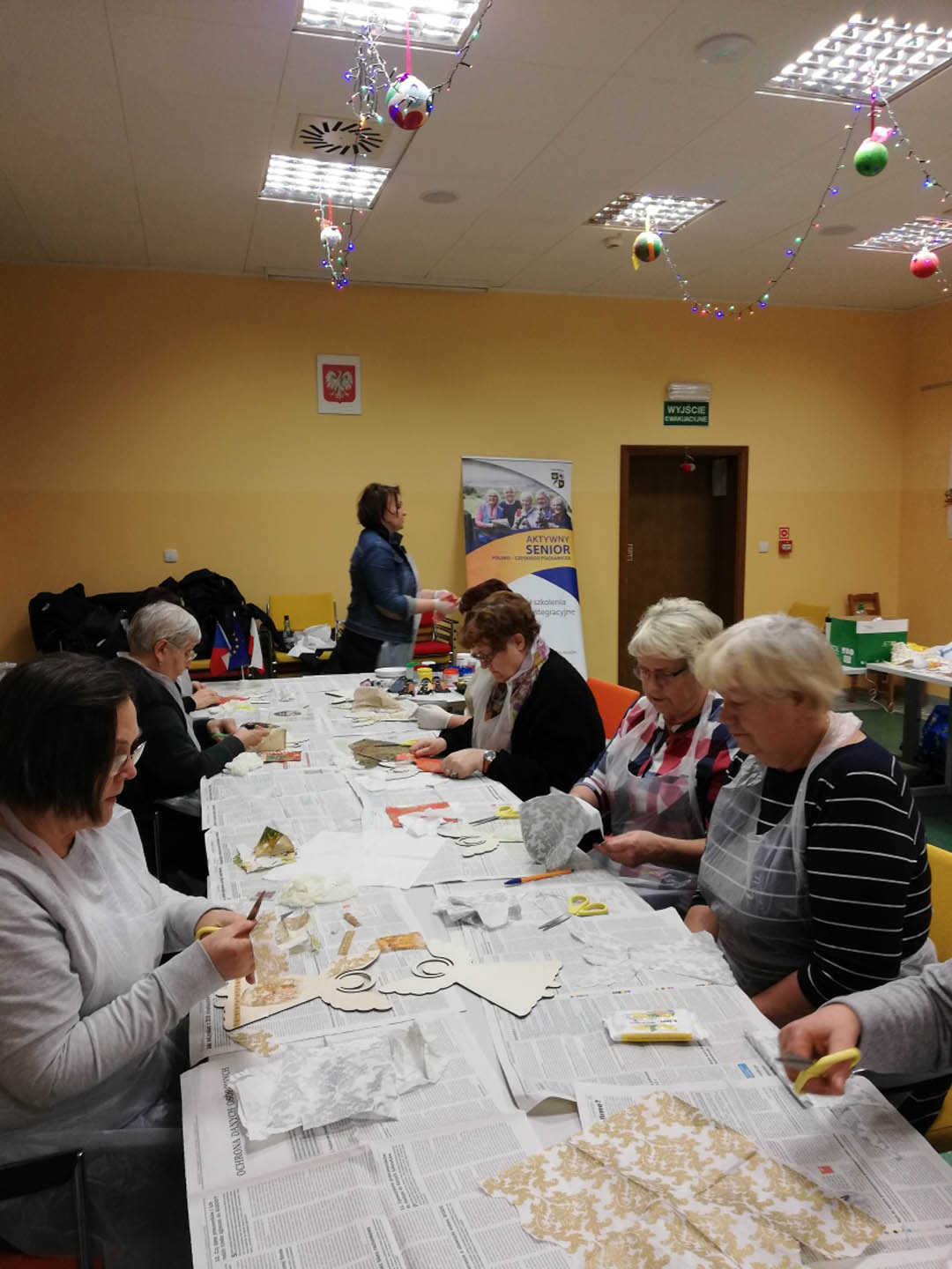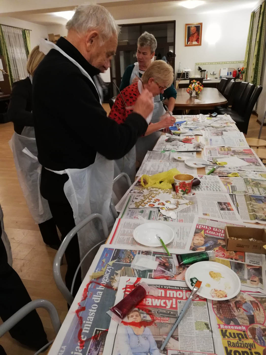 Podczas warsztatów w listopadzie, które przeprowadzone były dla każdej z grup, uczestnicy ozdobili wg własnych pomysłów stosując technikę decoupage: metalową doniczkę, anioła wykonanego ze sklejki, bombkę z pleksi, oraz wykonali stroik świąteczny.