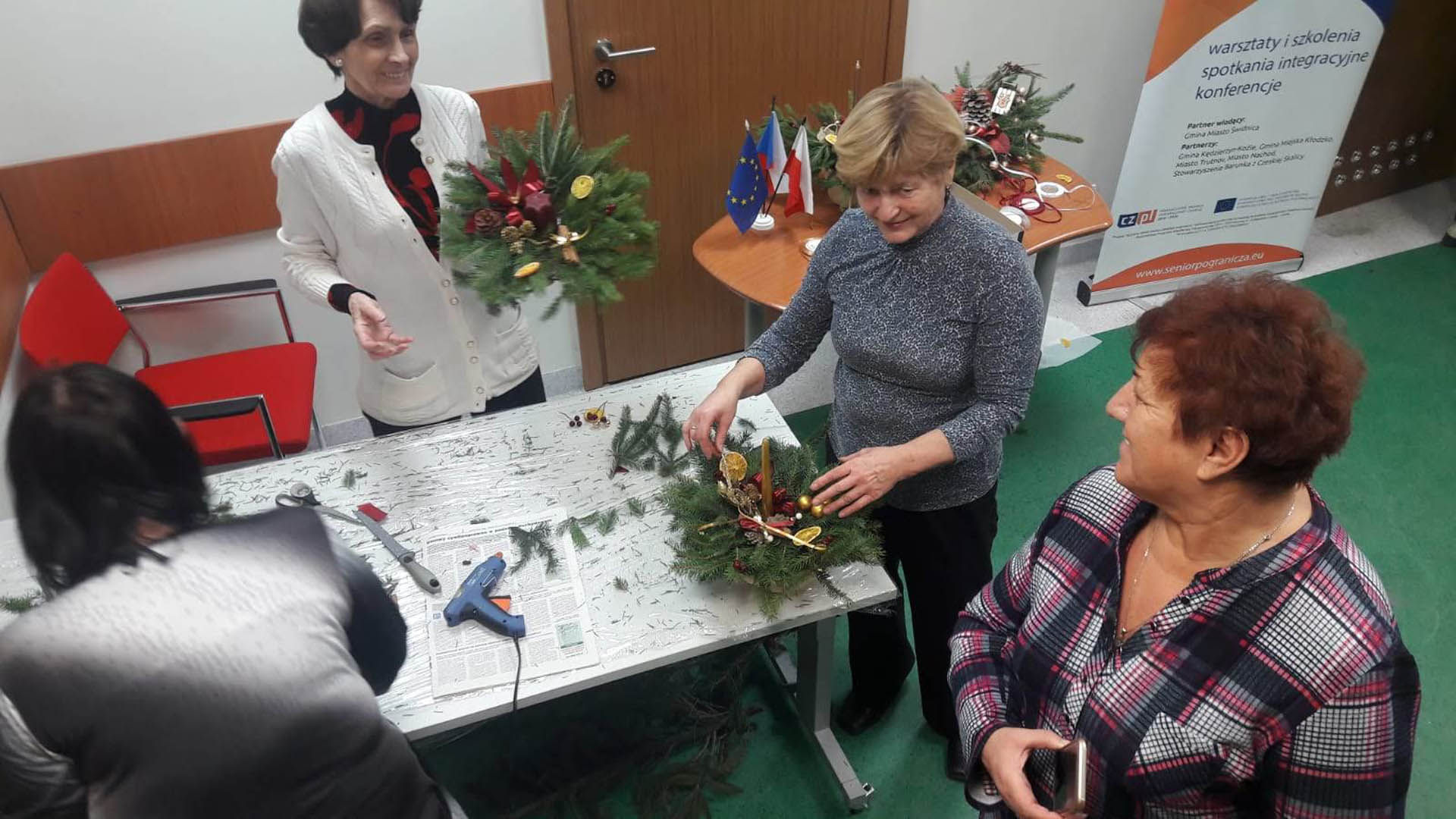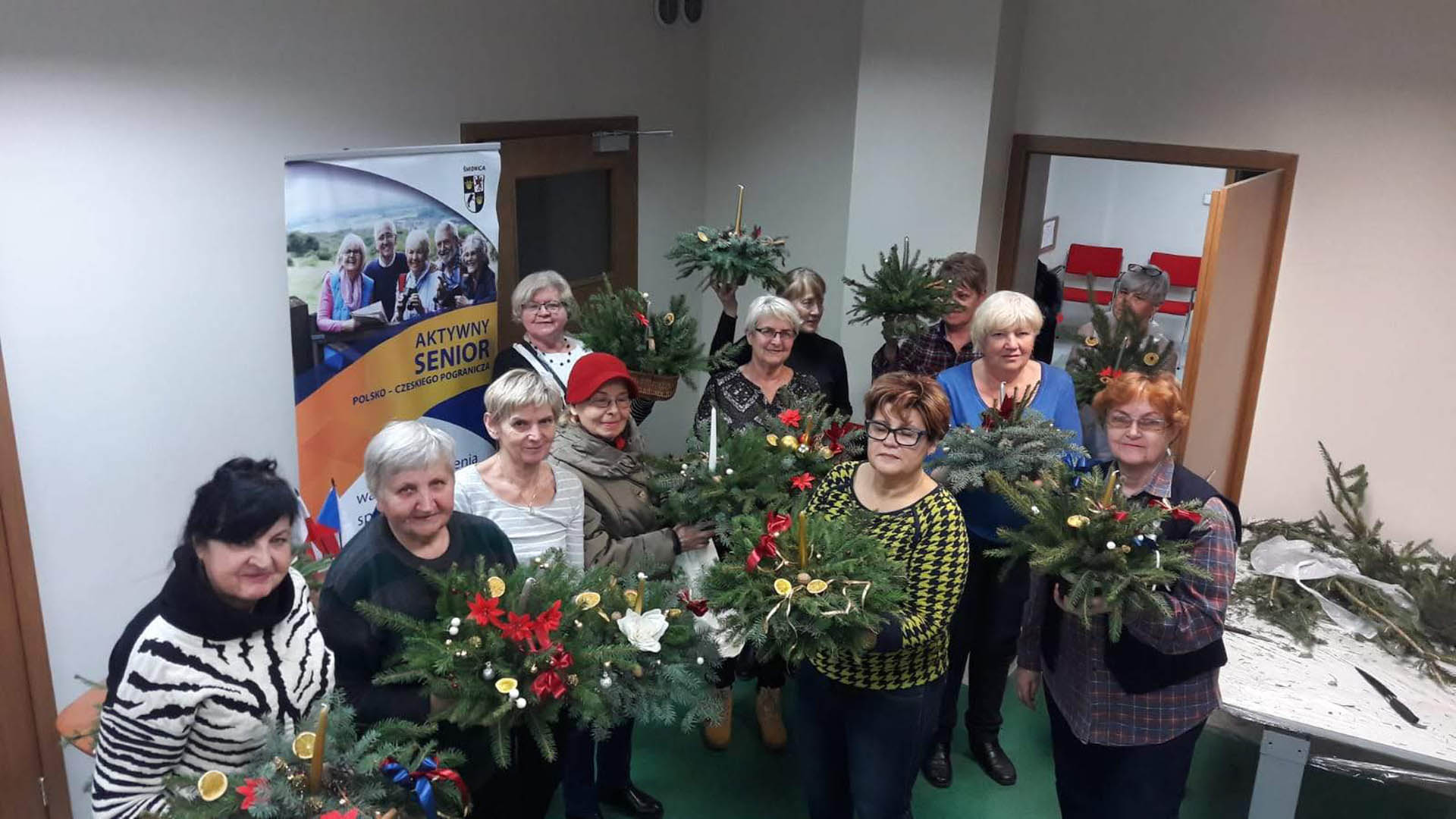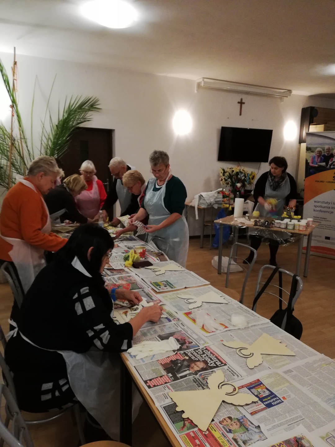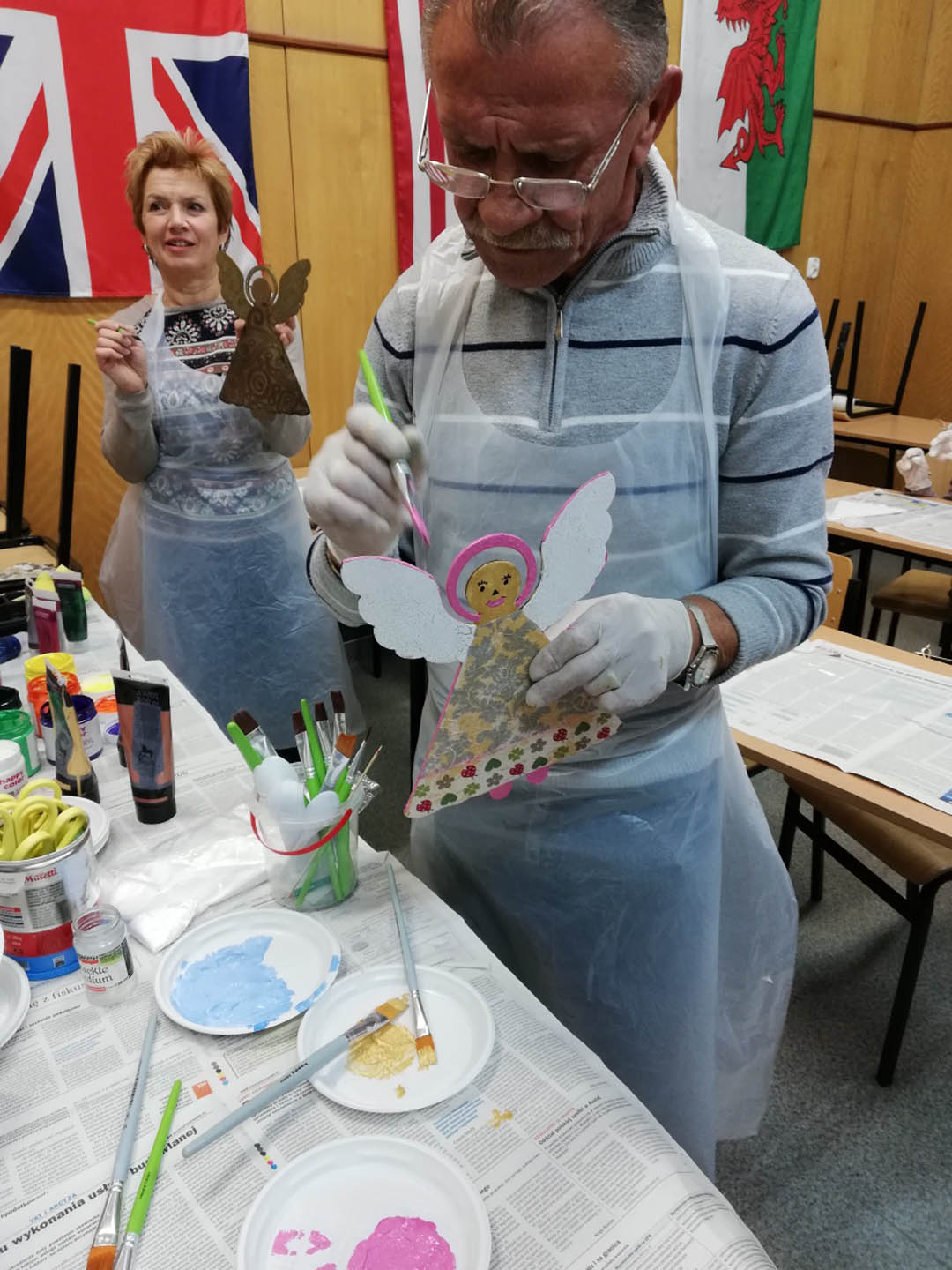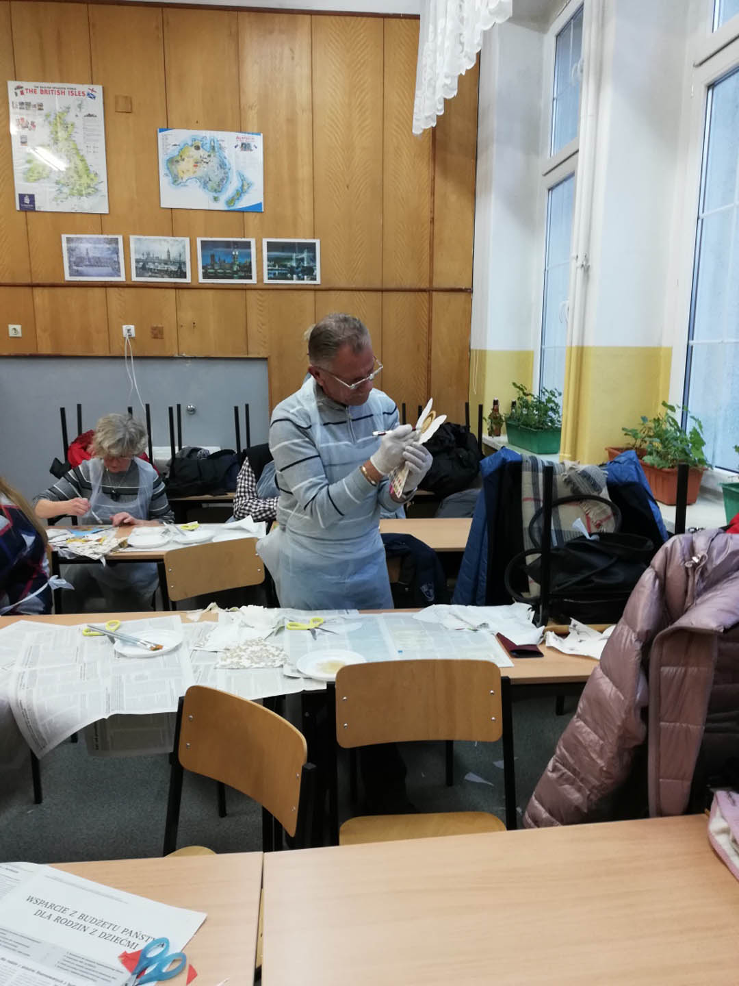 Podczas warsztatów w listopadzie, które przeprowadzone były dla każdej z grup, uczestnicy ozdobili wg własnych pomysłów stosując technikę decoupage: metalową doniczkę, anioła wykonanego ze sklejki, bombkę z pleksi, oraz wykonali stroik świąteczny.